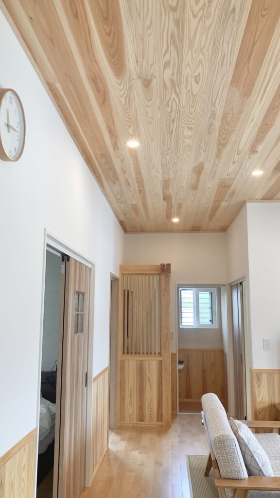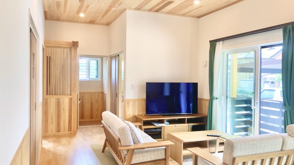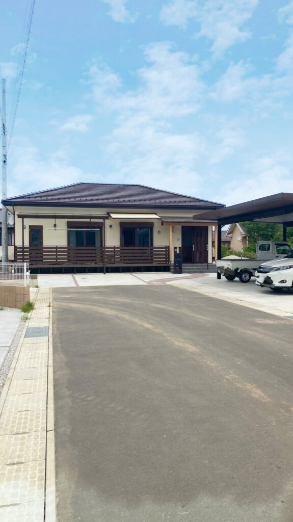 新築事例紹介1 2024.01.15 注文住宅 こちらの平屋はお二人暮らし用ということで2LDKの間取りを提案させていただきました。リビングを中心に廊下を設けず、すべての居室だけでなく脱衣場・トイレへ行き来ができるような無駄のない間取りになっています。